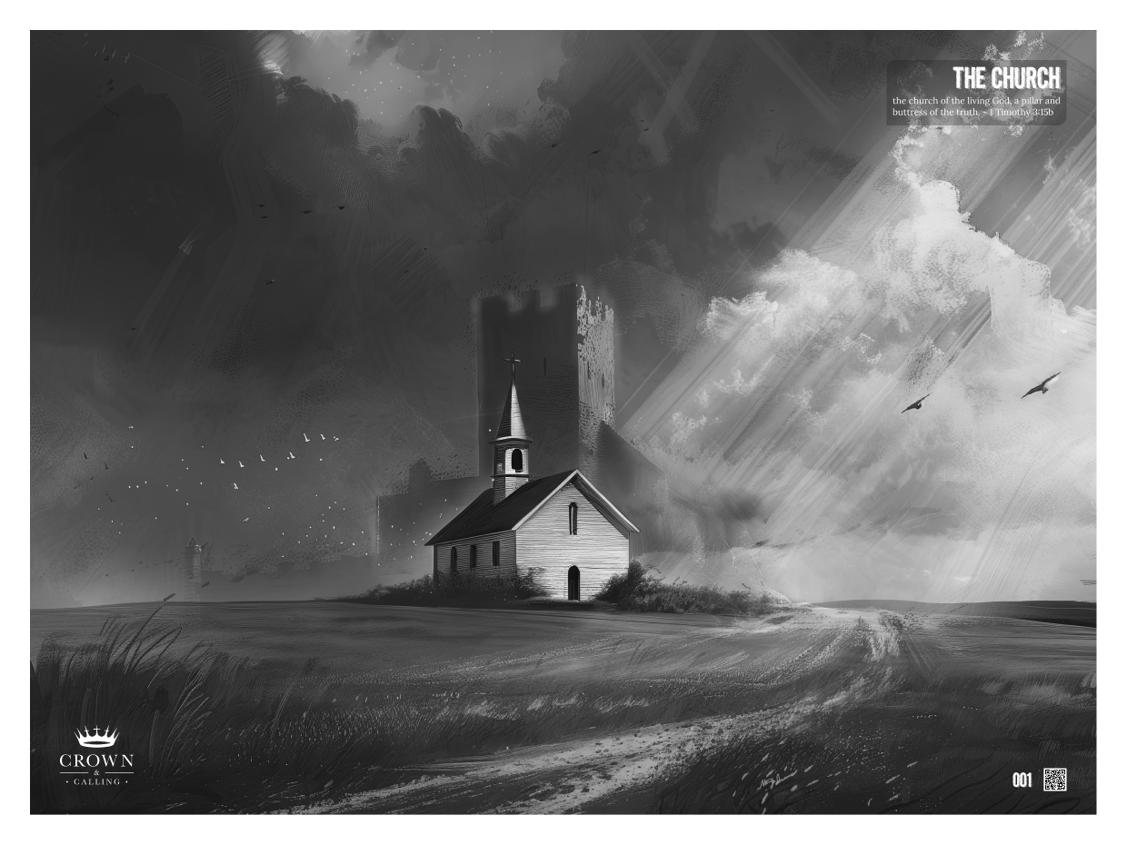 In this stirring black-and-white composition, a humble country church stands quietly in a vast open field, worn but upright, seemingly small against the dark, swirling skies that press in from every side. This is what we see: vulnerability, obscurity, fragility. But behind the church rises a mighty stone fortress, an afterimage that reveals God's perspective. What looks like a modest building to human eyes is, in truth, a pillar and buttress of the truth—immovable, eternal, and built on Christ Himself.
